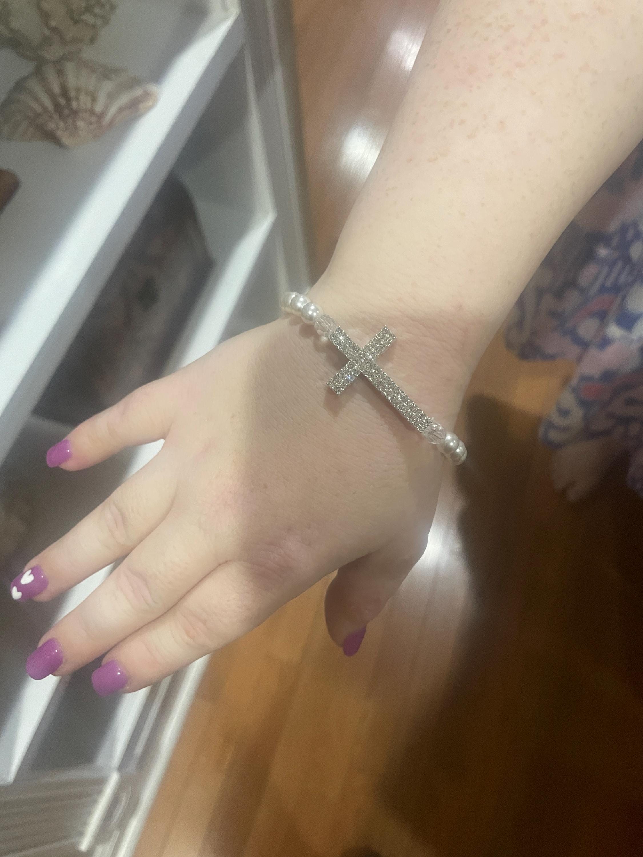The Swarovski pearls and AB crystals measure 6mm, while the rhinestone cross link measures 37mm x 24mm. I created this bracelet in a stretch design for easy on and off. The bracelet measures 7.5", and I am happy to custom any size that works better for you.