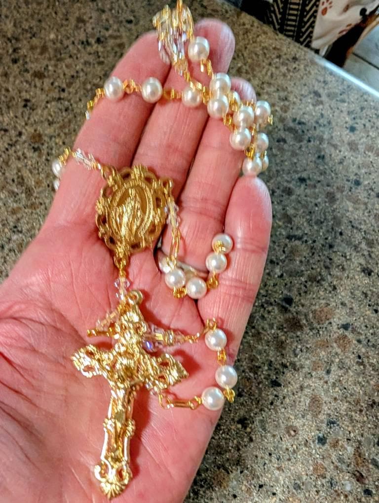 This Swarovski white pearl rosary is beautiful to hold, with a soft drape in your hand. I hand turn each link using gold plated eye pins.. I used 6mm white Swarovski pearls for Ave beads... 8mm clear Swarovski crystal for Pater beads...and clear crystal gold rondelles and 4mm crystal bicone beads for accents.