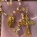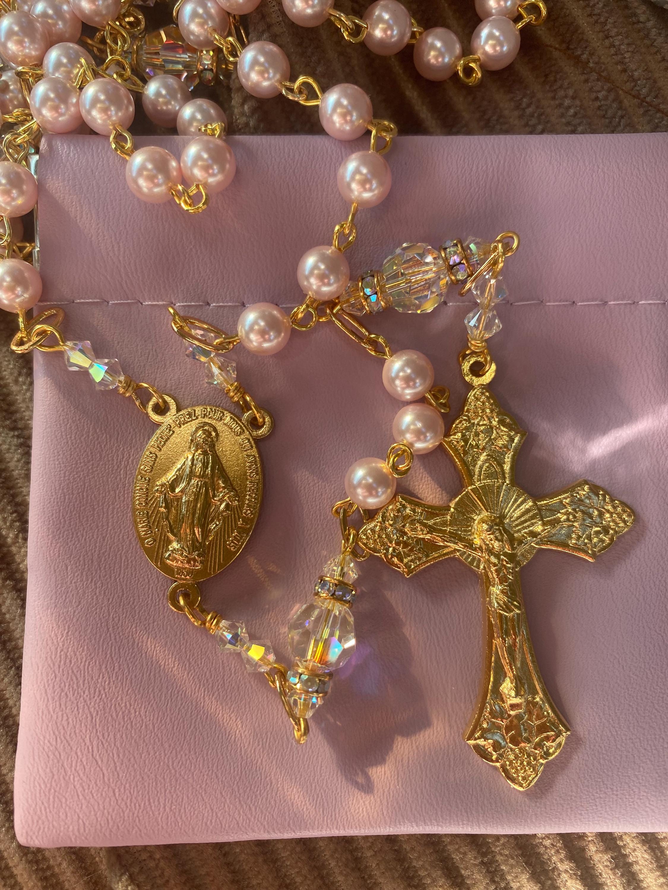 This Swarovski pink pearl rosary is beautiful to hold, with a soft drape in your hand. I hand turned each link using gold plated eye pins. used 6mm pink Swarovski pearls for Ave beads... 8mm AB Swarovski crystal for Pater beads...and AB crystal gold rondelles and 4mm crystal bicone beads for accents.