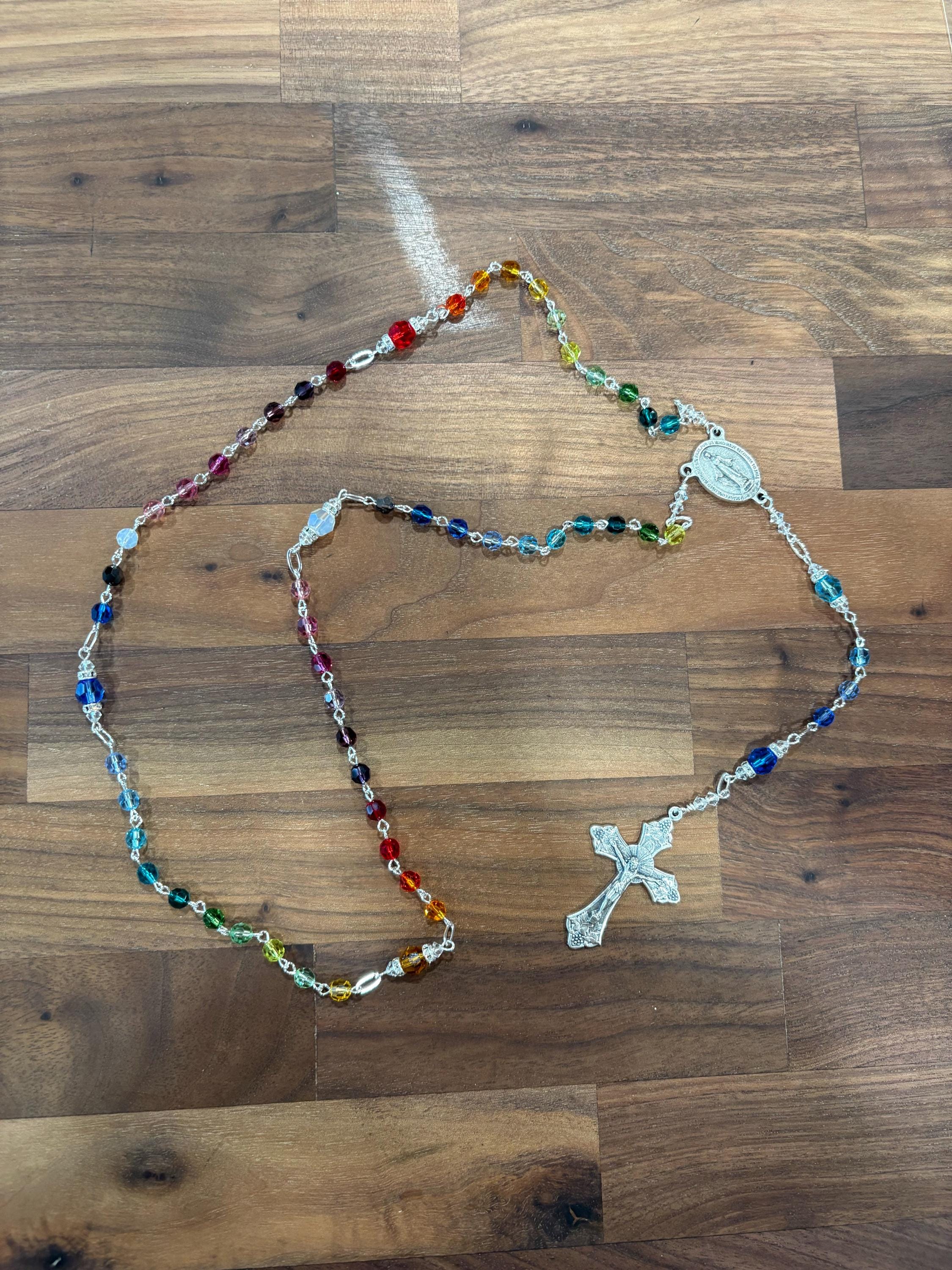 This joyful rosary was created using 23 different shades of Swarovski crystal...each color enhanced by the next. It's a beautiful, sparkling, rainbow of color!! Both 6mm and 8mm round Swarovski multi colored crystals were used for the Aves and Paters, with clear 4mm bicones and silver crystal rondelles completing the design.