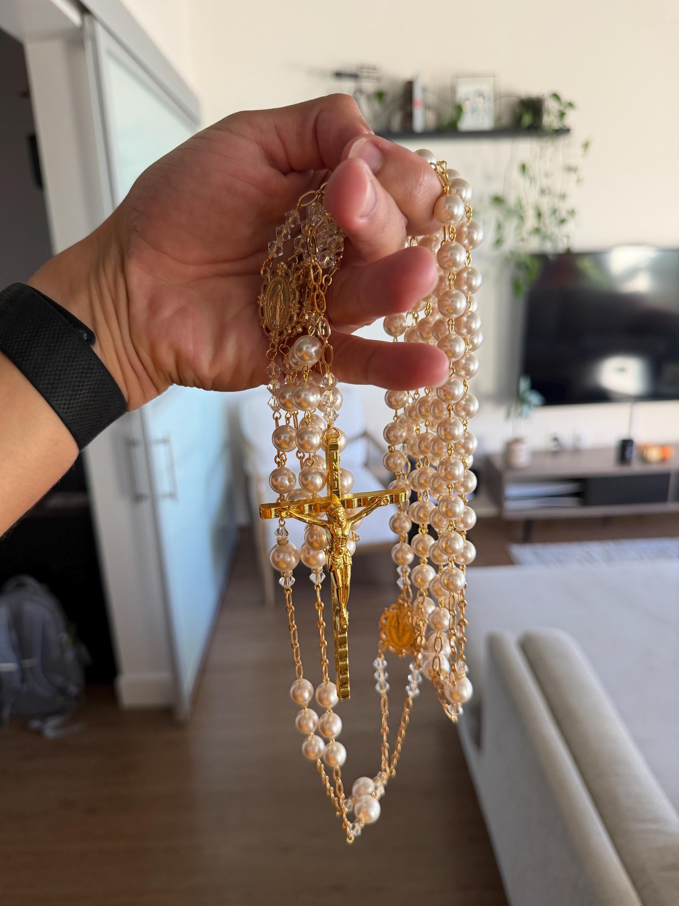 I created this design using 10mm Swarovski Crystal White Pearls for the Aves and 12mm Swarovski Crystal White Pearls for the Paters. Each link is hand turned by me. Surrounding each Pater is a pair of Swarovski gold Clear Crystal Rondelles and 4mm Swarovski clear round crystal beads.