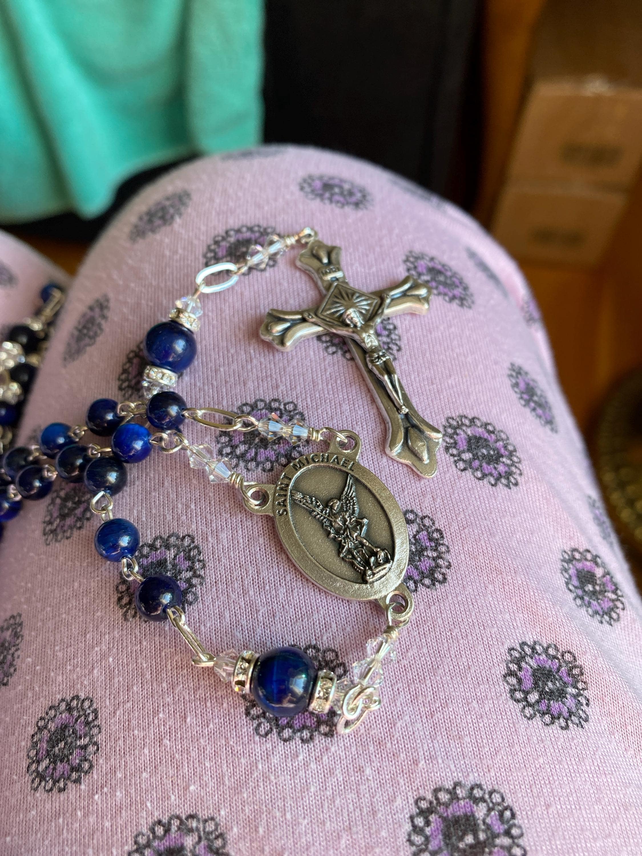 I was truly inspired by this stunning Lapis Lazuli Blue Tiger Eye gemstone bead. The Tiger Eye looks like a blue line...what a perfect bead to create a "Thin Blue Line" St Michael rosary to honor and pray for those who serve and protect this great country!