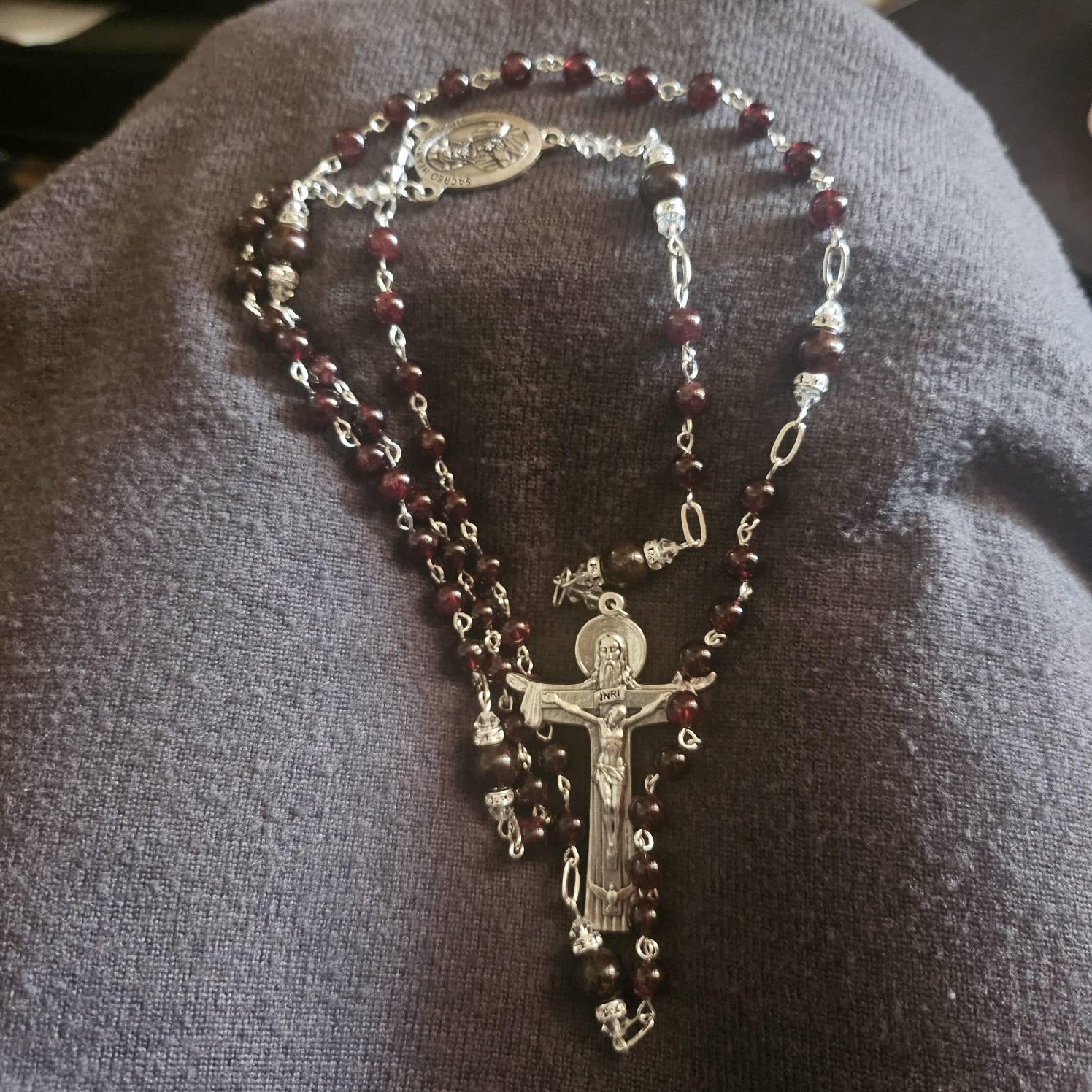 The rosary uses Grade AAA garnet for both the 6mm Aves and 8mm Paters. Surrounding each Pater is a pair of Swarovski clear crystal bicones as well as 4mm Swarovski clear bicones as spacers.